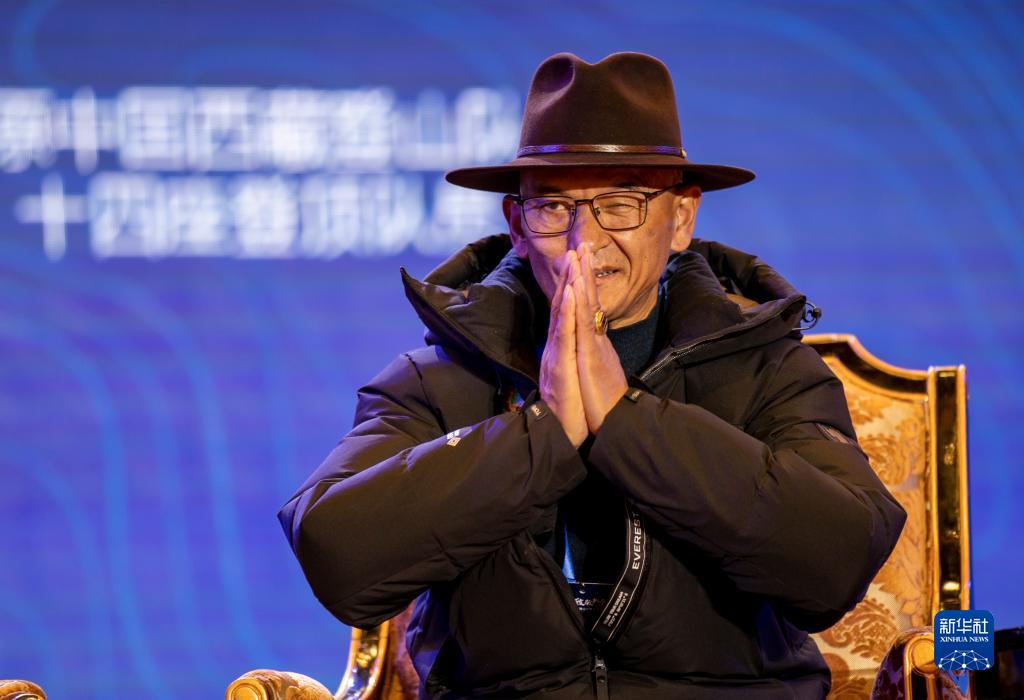 12月11日,原西藏登山隊登頂世界十四座海拔8000米以上高峰探險隊隊長桑珠在交流大會上向觀眾致意。新華社記者 姜帆 攝