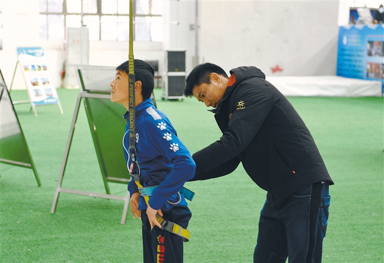 教練幫助學員做好攀巖前的準備工作。記者 旦增蘭澤 攝