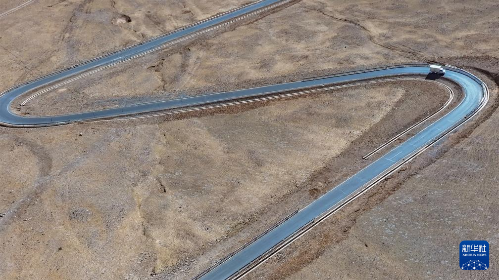 申扎縣供銷合作社為馬躍鄉貝嘎四村偏遠鄉鎮果蔬配送試點項目直銷點配送新鮮果蔬的貨車,行駛在盤山公路上,這個村距離申扎縣城150公里(無人機照片,1月5日攝)。新華社記者 旦增尼瑪曲珠 攝