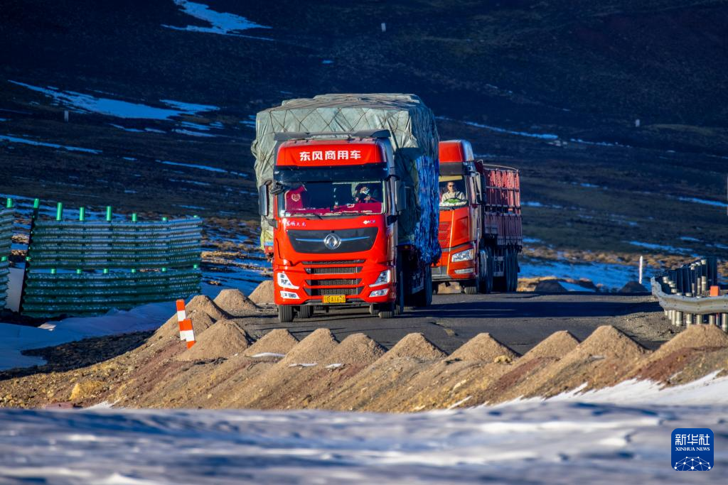 運載著申扎縣供銷合作社為偏遠鄉鎮果蔬配送試點項目從西寧采購的50噸新鮮果蔬的貨車經過唐古拉山口(1月3日攝)。新華社記者 曹檳 攝