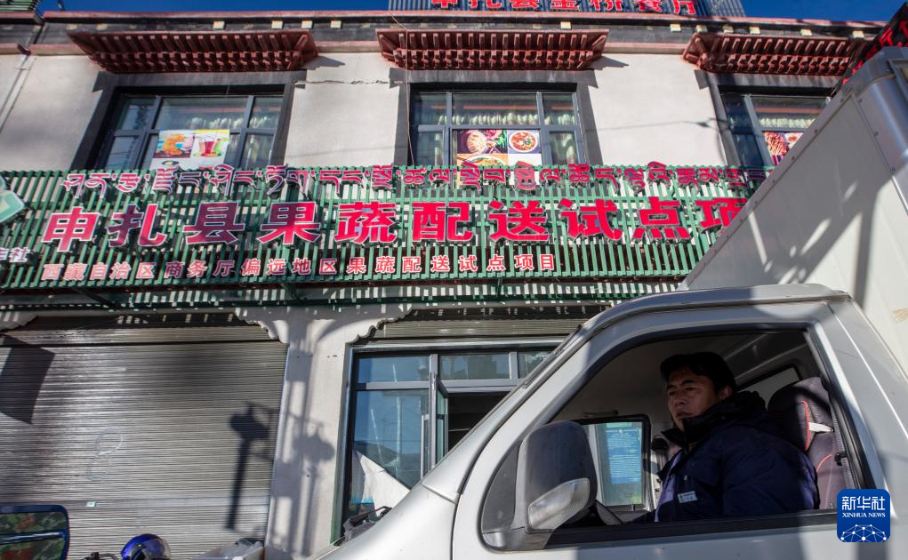 申扎縣供銷合作社的配送員巴拉從縣城總店出發,為馬躍鄉貝嘎四村偏遠鄉鎮果蔬配送試點項目直銷點運送新鮮果蔬(1月5日攝)。新華社記者 姜帆 攝