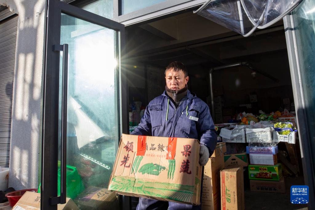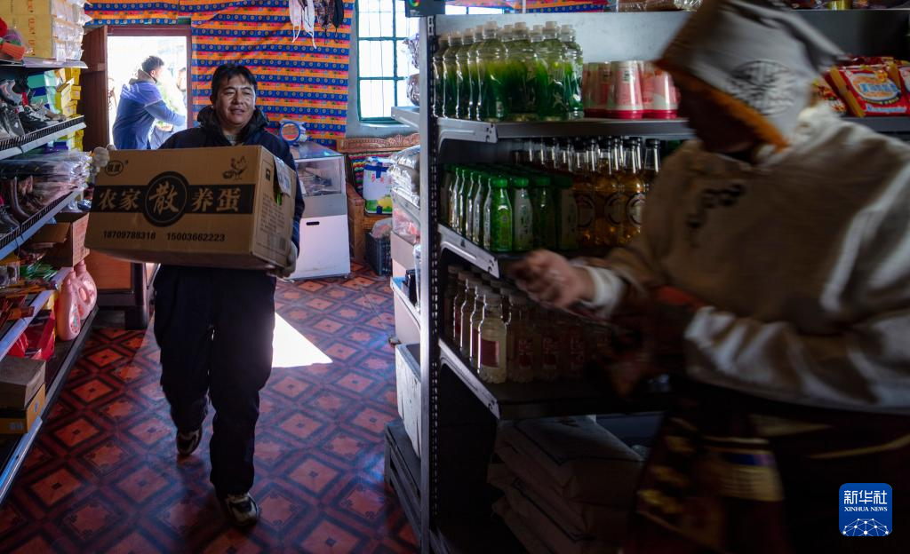 申扎縣供銷合作社的配送員次仁桑珠在縣城總店為馬躍鄉貝嘎四村偏遠鄉鎮果蔬配送試點項目直銷點上貨(1月5日攝)。新華社記者 曹檳 攝