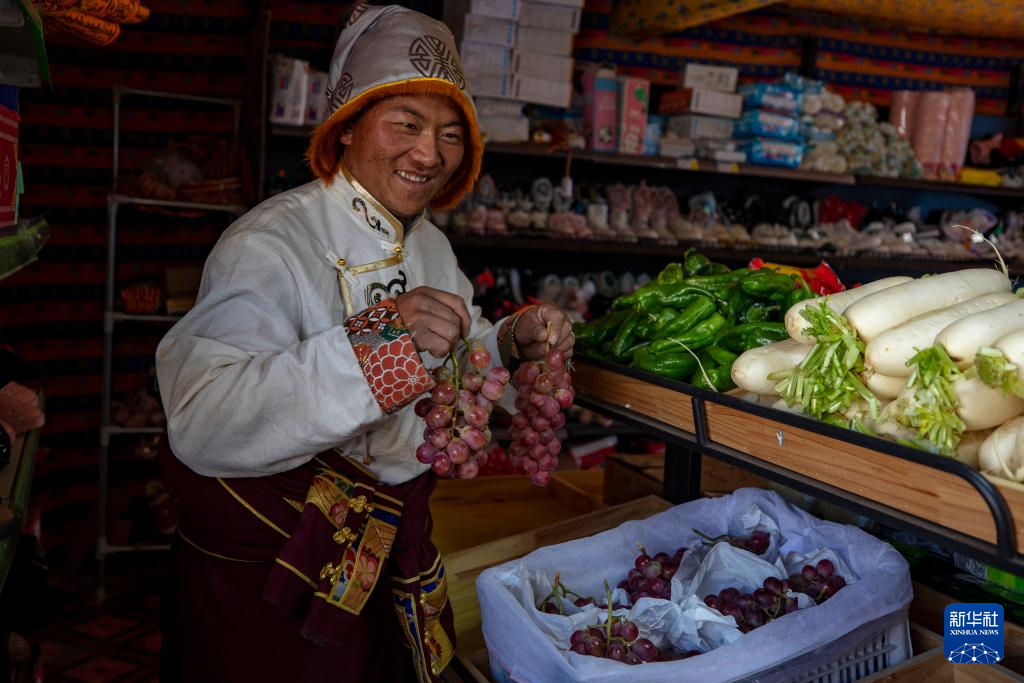 申扎縣馬躍鄉貝嘎四村偏遠鄉鎮果蔬配送試點項目直銷點店主西熱加措在整理供銷合作社配送來的新鮮紅提(1月5日攝)。新華社記者 旦增尼瑪曲珠 攝