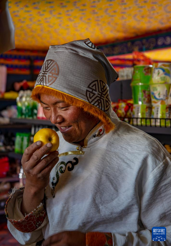申扎縣馬躍鄉貝嘎四村偏遠鄉鎮果蔬配送試點項目直銷點店主西熱加措拿起供銷合作社配送來的水果(1月5日攝)。新華社記者 姜帆 攝