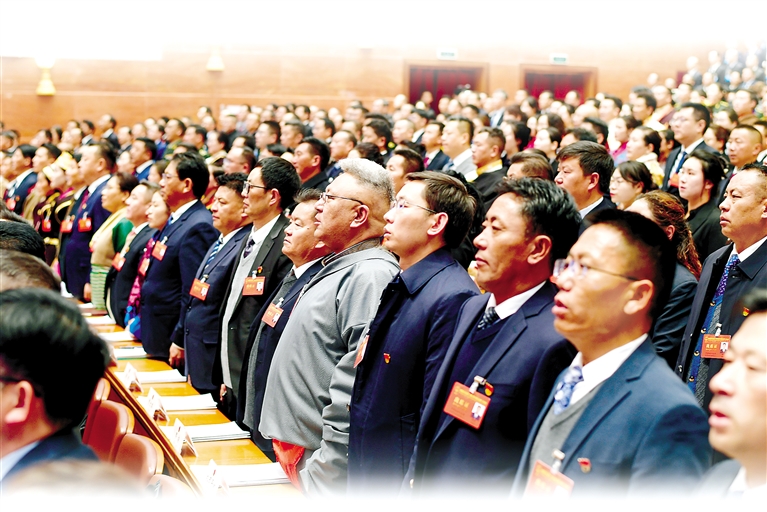圖為西藏自治區人大代表們齊唱國歌。 記者 潘多 攝