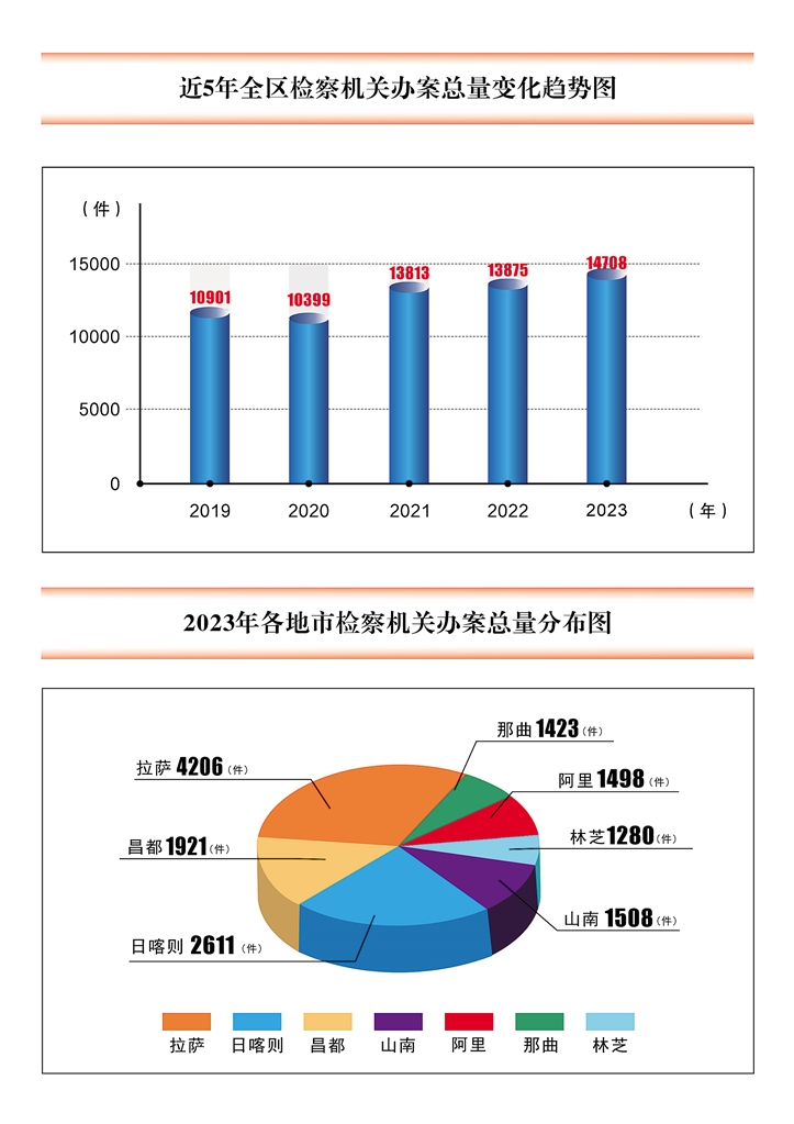 “2023年,全區檢察機關在自治區黨委和最高檢正確領導下,以習近平新時代中國特色社會主義思想為指導,深入貫徹習近平法治思想、習近平總書記關于西藏工作的重要指示和新時代黨的治藏方略,全面貫徹黨的二十大精神、自治區第十次黨代會和十屆區黨委歷次全會精神、全國檢察長會議精神,認真落實自治區十二屆人大一次會議決議,自覺把檢察工作放到黨的治藏穩藏興藏大局中謀劃推進,聚焦‘四件大事’聚力‘四個創建’,忠誠依法能動高質效履職取得新成效。全年辦理各類法律監督案件14708件,同比增長6%。依法主動辦案8030件,占54.6%,主動辦案量首次超過被動受理案件量。‘四大檢察’結構持續優化為56∶18∶7∶19,業務質效穩步提升。”1月8日下午,西藏自治區人民檢察院檢察長夏克勤在西藏自治區第十二屆人民代表大會第二次會議上作工作報告。報告全面反映了西藏檢察機關一年來始終牢記“國之大者”,以實現“努力讓人民群眾在每一個司法案件中感受到公平正義”為目標,深入踐行“高質效辦好每一個案件”,充分發揮檢察職能作用,在為大局服務、為人民司法、為法治擔當中所做的主要工作,同時描繪了2024年的西藏檢察工作藍圖。