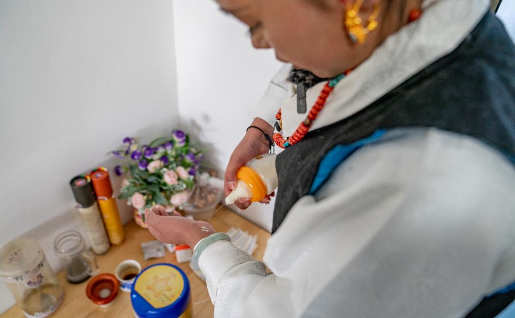 1月8日,愛心媽媽旦增卓瑪給孩子沖奶粉時試溫。新華社照片,拉薩,2024年1月9日 新華社發(丁增尼達攝)