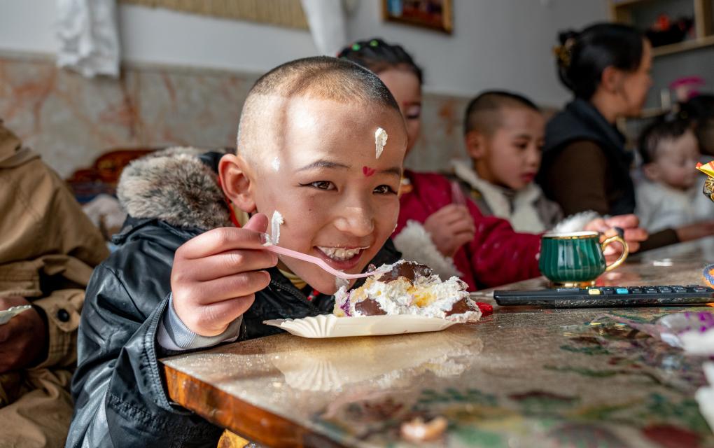 1月8日,“幸福家庭”的孩子們在吃蛋糕。新華社照片,拉薩,2024年1月9日 新華社發(丁增尼達攝)