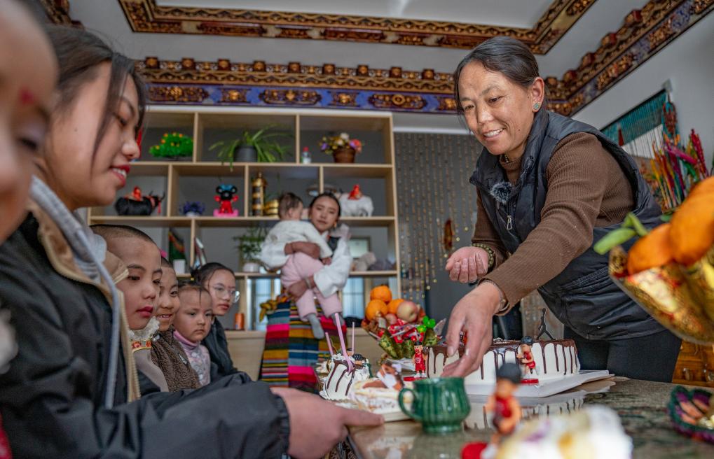 1月8日,愛心媽媽巴桑給孩子們分發蛋糕。新華社照片,拉薩,2024年1月9日 新華社發(丁增尼達攝)