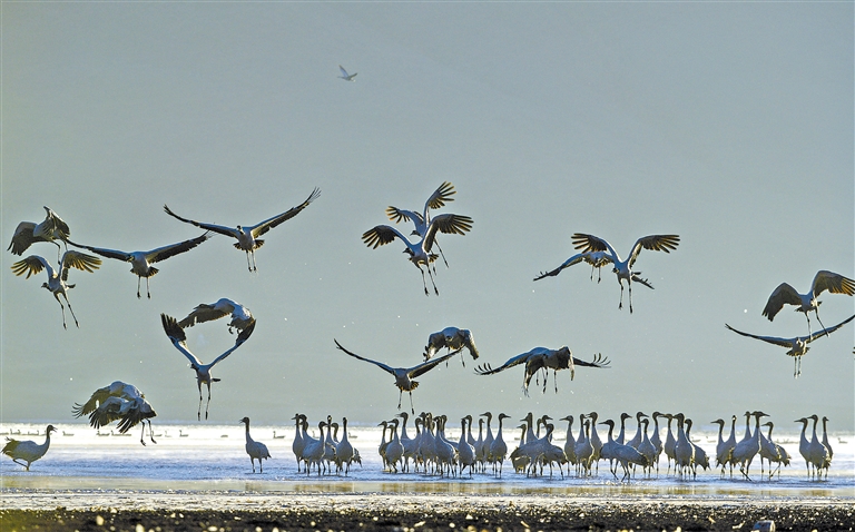 圖為林周縣境內的黑頸鶴在冬日朝陽下嬉戲。記者 潘多 攝