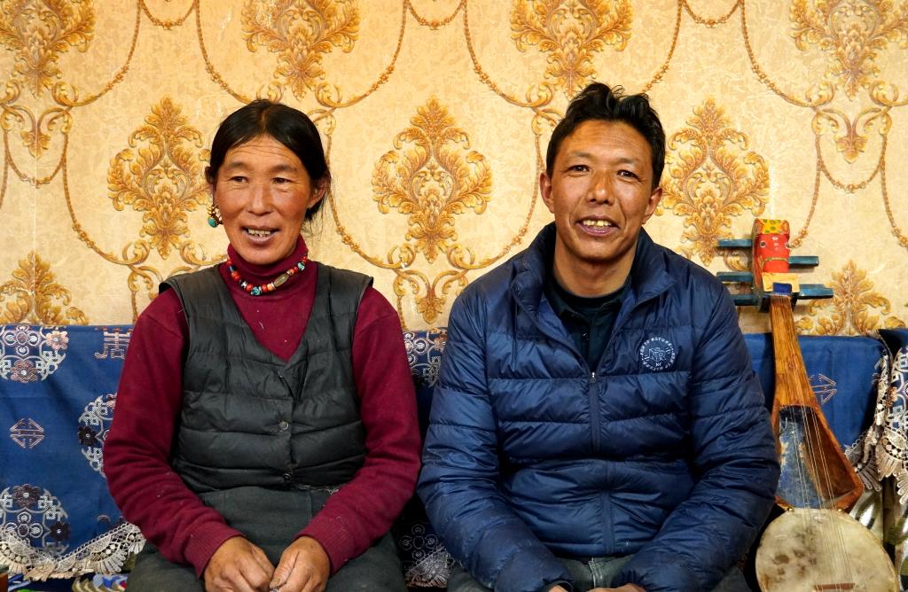札達縣楚魯松杰鄉巴卡村巴角組村民歐珠多吉夫婦在新房客廳合影(1月14日攝)。新華社記者陳尚才 攝