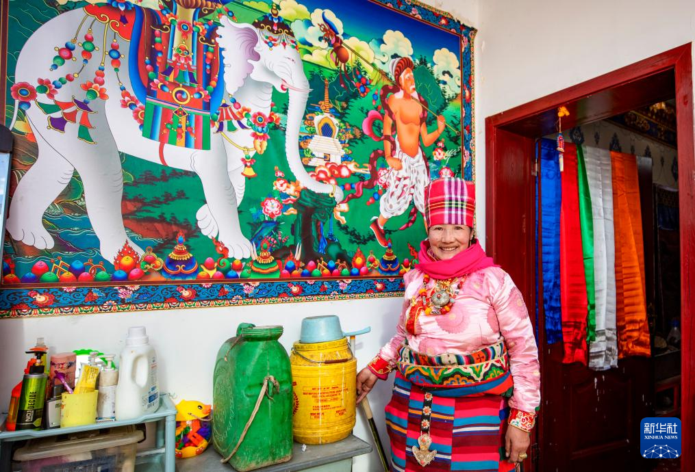 今年51歲的戶主格桑松塔說,以前冬天用水要去幾公里外的湖上鑿冰,后來要去幾百米外的機電井水房背水,自從2023年11月搬入新居,足不出戶就能用上水。他身旁,連接上水管的洗衣機正發出工作的轟隆聲。