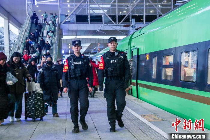 圖為春運首日,拉薩鐵路公安處特警巡查即將發送的列車。王興楠 攝