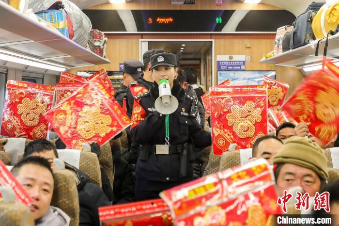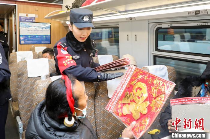 圖為春運首日,在拉薩發往日喀則的C921次列車上,乘警向旅客送上新春的祝福。黃飛 攝