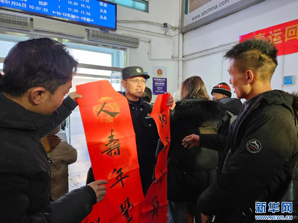 在候車(chē)大廳,那曲站派出所邀請(qǐng)那曲市文聯(lián)4名書(shū)法家在現(xiàn)場(chǎng)為群眾寫(xiě)春聯(lián)、送去新春的祝福。