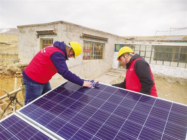 “次桑在家嗎?我們過(guò)來(lái)看一下你們新年準(zhǔn)備得怎么樣了?”聽(tīng)到劉光輝的呼喚,孩子們都跑出來(lái)迎接這位“小黃帽”叔叔。劉光輝和羅桑歐珠進(jìn)屋放下年貨,顧不上休息,立馬搭梯子爬上次桑家的房頂,用抹布拂去光伏電板上的塵土,拿出工具仔細(xì)檢查電源和光伏設(shè)備是否有損壞。“次桑家用的是我們的第一代太陽(yáng)能光伏電板,這個(gè)電板要經(jīng)常擦拭,保持表面干凈,發(fā)電效率會(huì)更好。”劉光輝說(shuō)。檢修完光伏電板后,劉光輝和羅桑歐珠又回到屋內(nèi)檢查次桑家的電路線路,對(duì)插排插座等可能存在安全隱患的地方進(jìn)行認(rèn)真排查。確保沒(méi)有問(wèn)題后,兩人將之前昏暗的燈泡全部換成了最新的節(jié)能燈泡,整個(gè)屋子一下亮堂了起來(lái)。