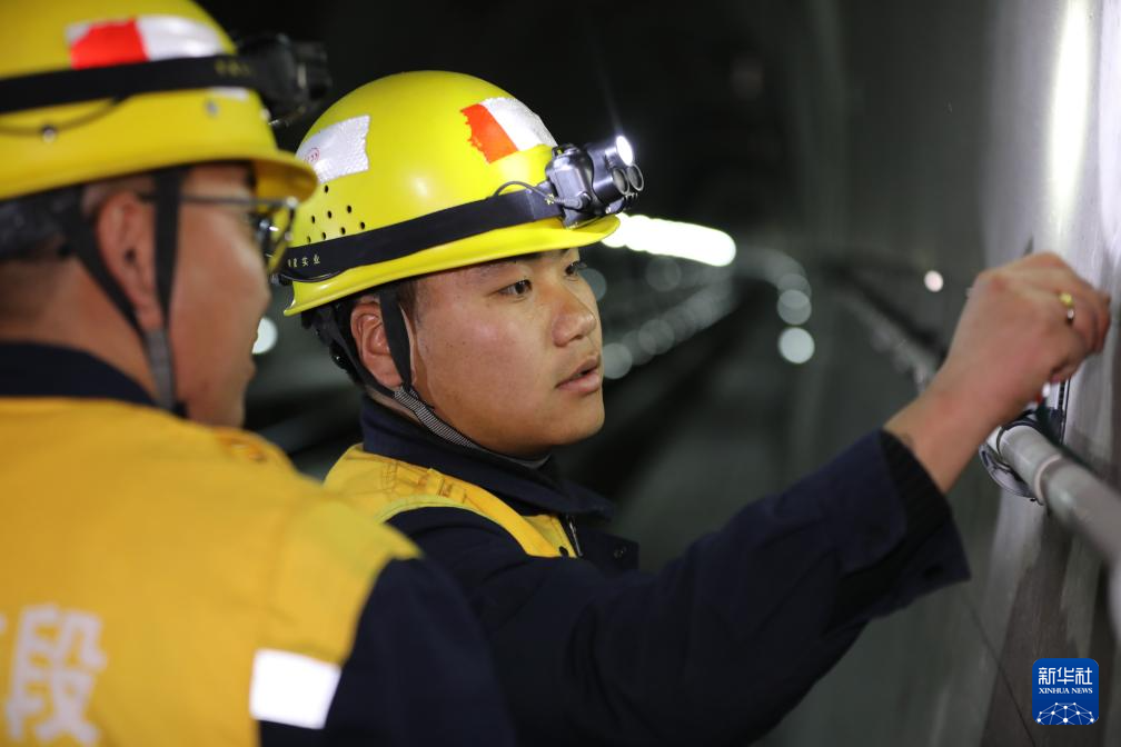 加查橋隧工區副工長東生瑞(左)檢查達嘎拉隧道狀況(1月27日攝)。新華社發(拉巴次仁攝)
