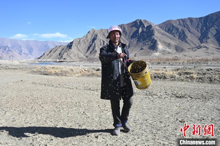 當日巡護,他帶了一些青稞補飼,嫻熟地灑在江邊的田地里,不斷觀望是否有黑頸鶴的身影。他告訴中新網記者:“這是黑頸鶴常來的地方,你看還有一些羽毛,地里還有很多爪印。”