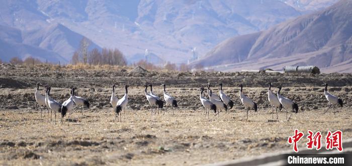 圖為悠閑覓食的黑頸鶴。薩迦縣宣傳部供圖