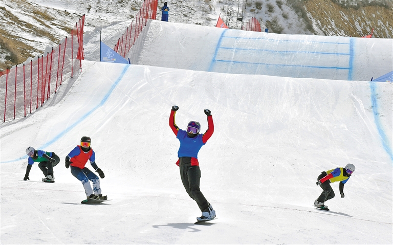 圖為西藏選手尼瑪擁青參加單板滑雪障礙追逐賽。洛桑 索朗群培 攝