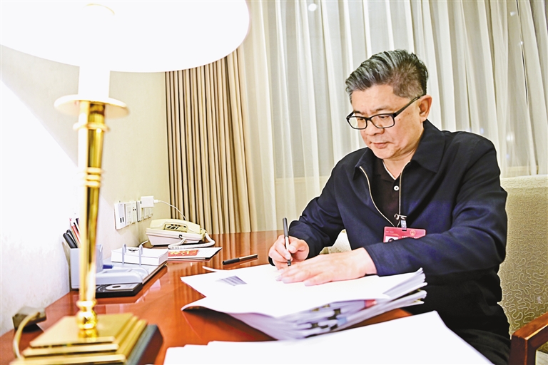 圖為全國人大代表王強在駐地整理發言材料。記者 旦增西旦 攝