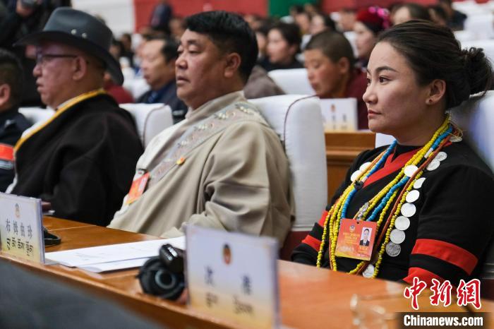 資料圖為2024年1月9日,西藏自治區兩會期間,少數民族界政協委員、墨脫縣達木珞巴民族鄉女鄉長布姆曲珍(右一)在拉薩參會。江飛波 攝