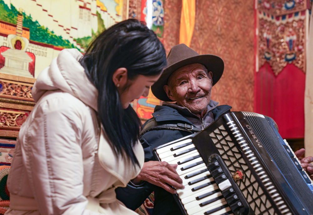 2024年3月14日,嘎東社區居民朗杰(右)指導孫女索朗曲珍拉手風琴。新華社記者 晉美多吉 攝