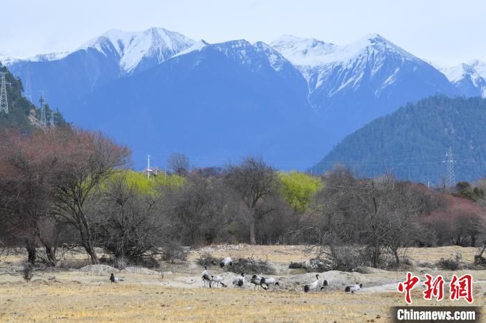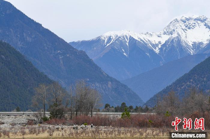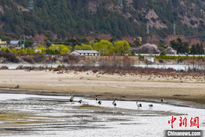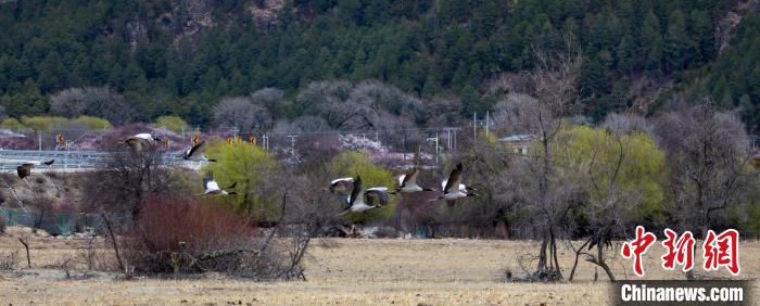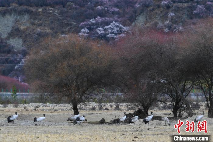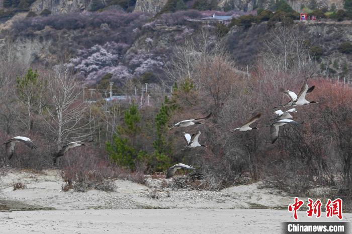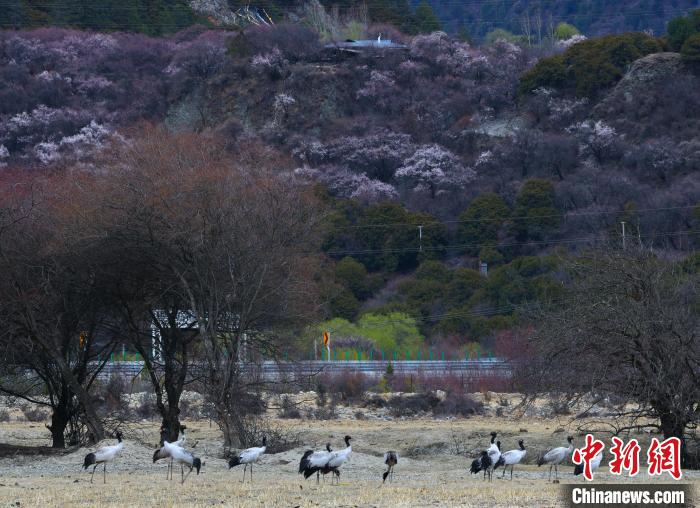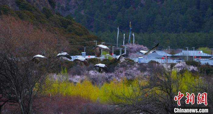 3月30日,在西藏林芝市巴宜區更章門巴民族鄉境內,黑頸鶴在村莊里、盛開的桃花前、雪山下翩翩起舞,形成一幅絕美的自然畫卷。黑頸鶴,被譽為“鳥類大熊貓”,是國家一級保護野生動物,也是世界上唯一在高原地區生長和繁殖的鶴類。近年來,西藏不斷加大黑頸鶴生存環境保護力度。據2022年冬季越冬黑頸鶴種群數量調查顯示,在西藏越冬的黑頸鶴種群數量達11175只,種群數量持續增長,并在西藏全區均有分布,其瀕危等級也從“易危”降為“近危”。在林芝,黑頸鶴在桃花與雪山間自由翱翔,展現了人與自然和諧共處的美好場景。