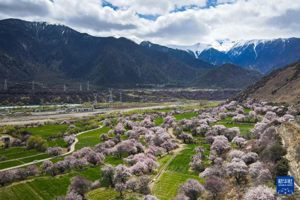 林芝市巴宜區朵當村盛開的桃花(3月30日攝,無人機照片)。新華社記者 丁增尼達 攝