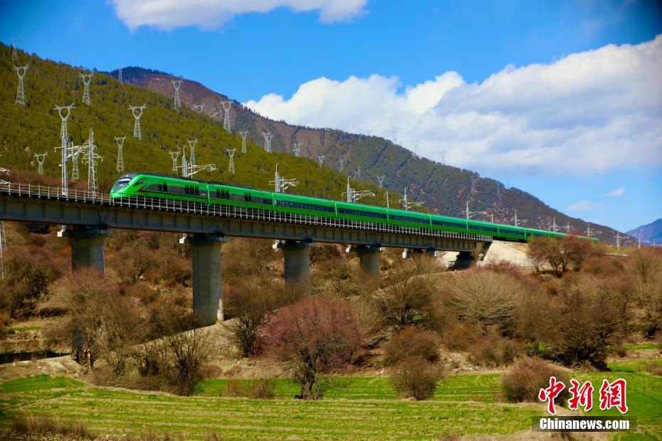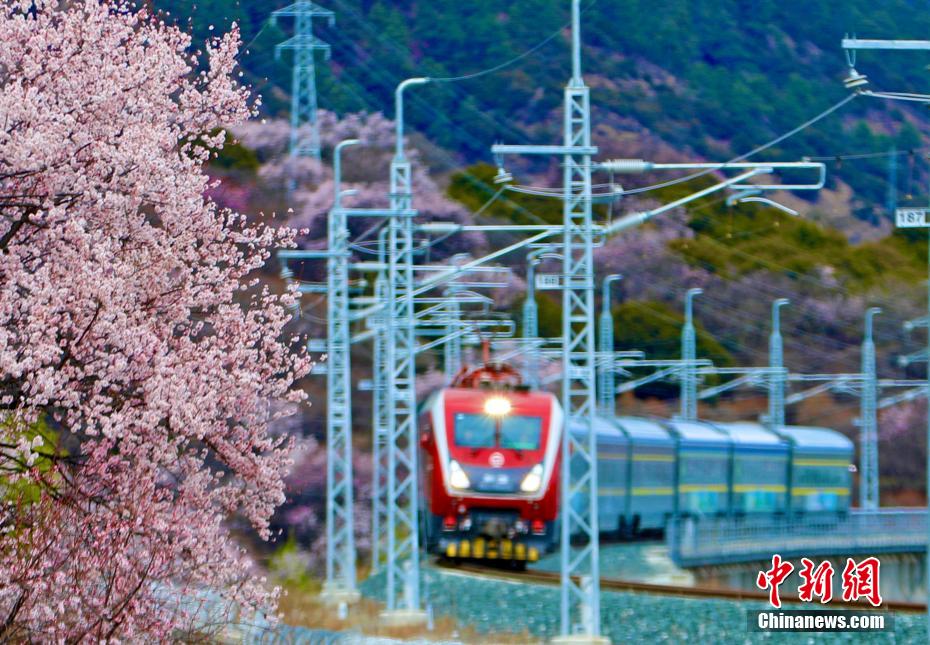 被譽為新“天路”的拉林鐵路,是中國首條高原電氣化鐵路,于2021年6月25日開通運營,結束了西藏東南地區(qū)不通鐵路的歷史。圖為拉林鐵路沿線桃花盛開,與飛馳而過的動車構成別樣風景圖。馬生明 攝