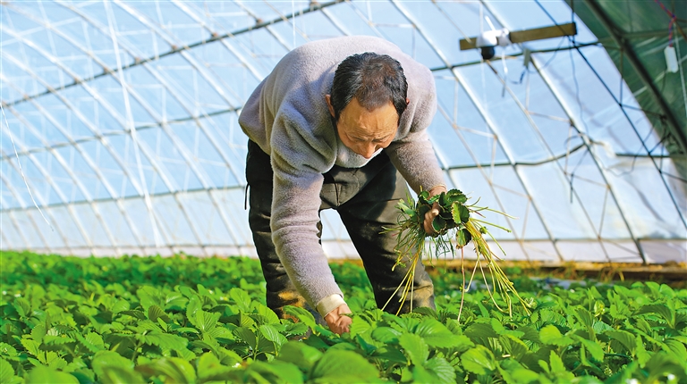 圖為吞彌現代農業產業園種植人員在草莓種植大棚內除雜草。記者 鹿麗娟 攝