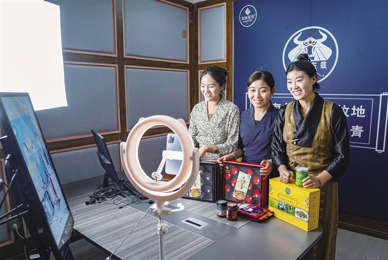 網絡主播在巴青縣“赤堆東雄”網紅直播間推介當地特色農牧產品。 新華社記者 孫非 攝