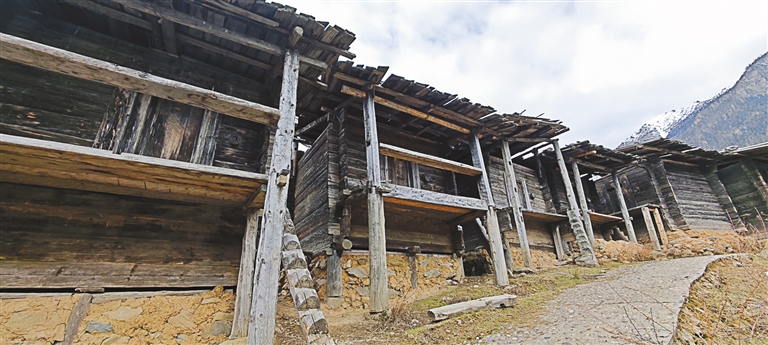村里最吸引人的所在是位于一處山丘上集中修建的糧倉。穿過蜿蜒的村中小路,與背著大簍松針的村民擦肩而過,我們攀爬到一座座吊腳木樓組成的糧倉前,十余間飽經風霜的木屋分成兩排立在我們面前。傳統上,日卡村每戶村民都將糧倉建在此處,既為防盜又互相監督,還通風防潮,里面保存有糧食、干肉等生活必需品。雖然現在家里都有了儲藏室和冰箱,但大家還是習慣在這里存放糧油和肉類。