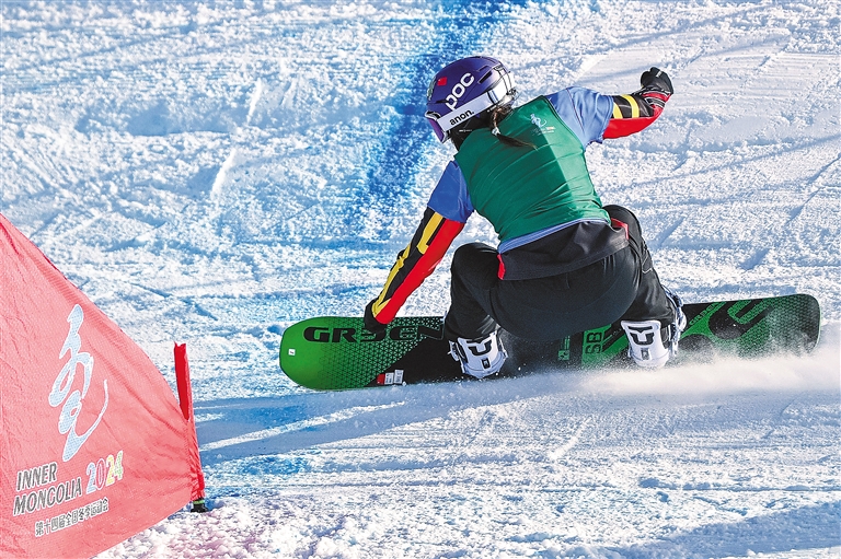 圖為2月19日,在內蒙古烏蘭察布市涼城滑雪場舉行的第十四屆全國冬季運動會單板滑雪青年組女子障礙追逐賽中,中國西藏隊選手擁青拉姆正在比賽(資料圖片)。新華社記者 伍志尊 攝