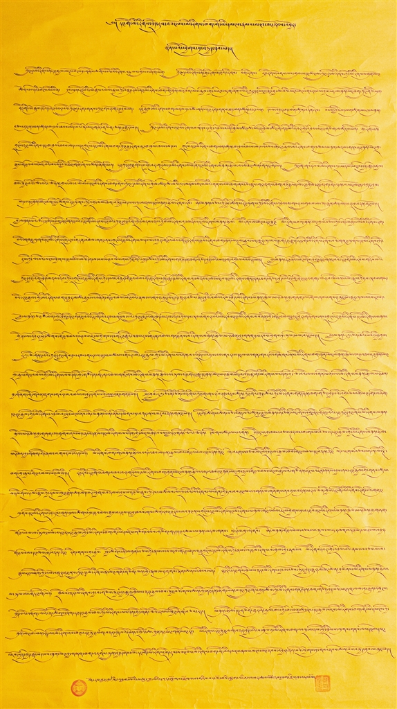 藏文書法一等獎作品《在黨的民族政策光輝照耀下各族人民繁榮發展》。作者 索朗歐珠