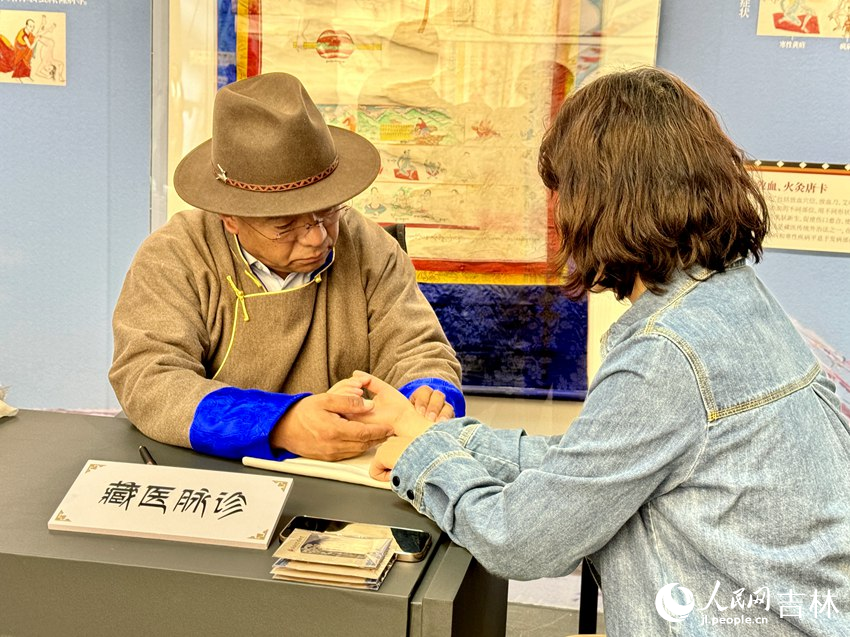 西藏自治區藏醫院藏醫主任醫師尼瑪為觀眾脈診、講解藏藥知識。人民網記者 李思玥 攝