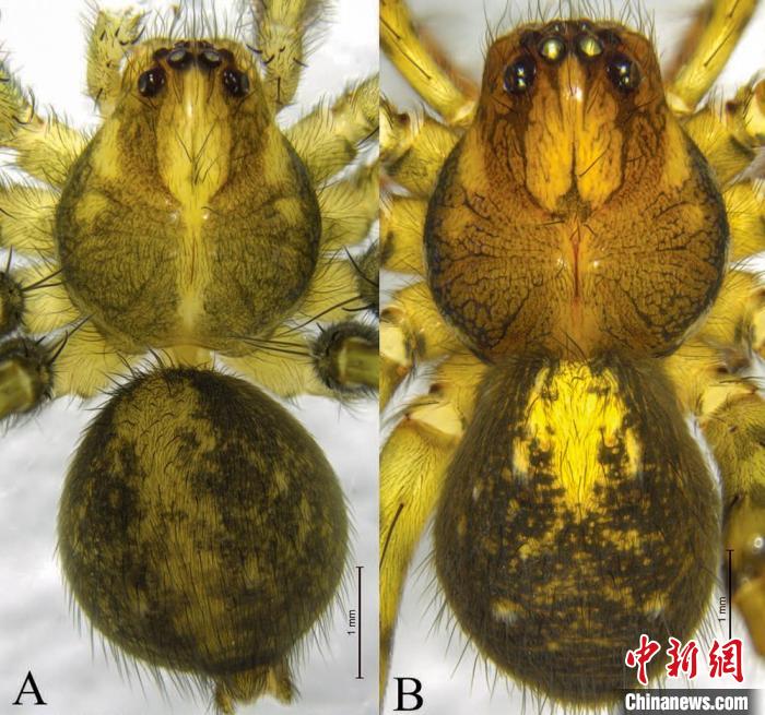 圖為錯那侵蛛雄蛛外形背面觀(A),雌蛛外形背面觀(B)。王露雨 攝