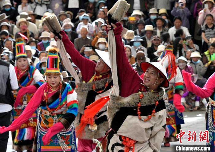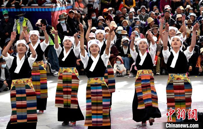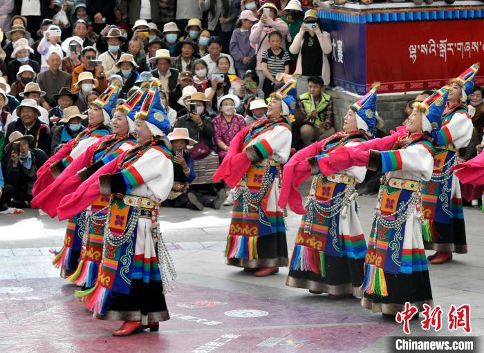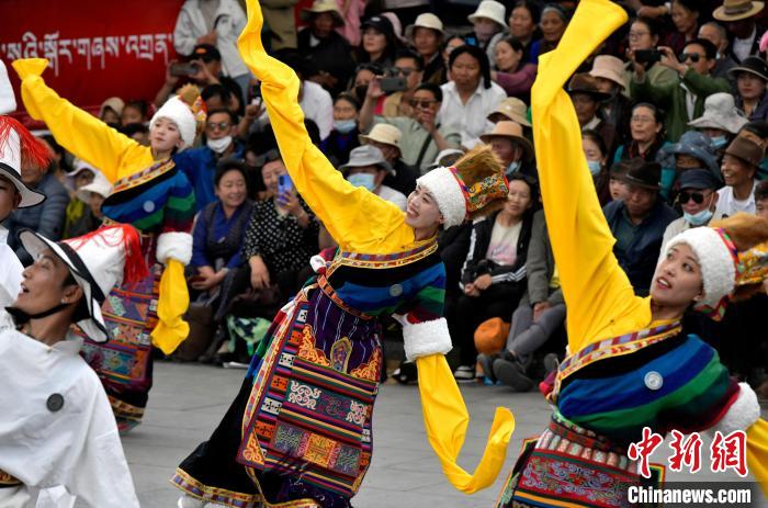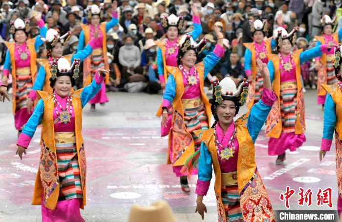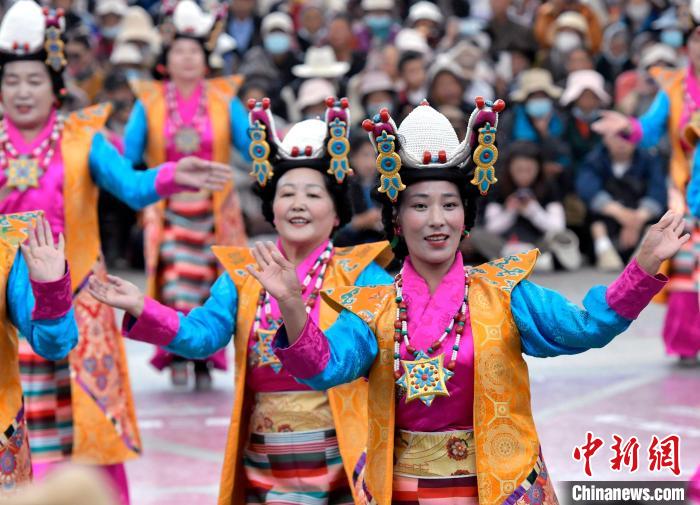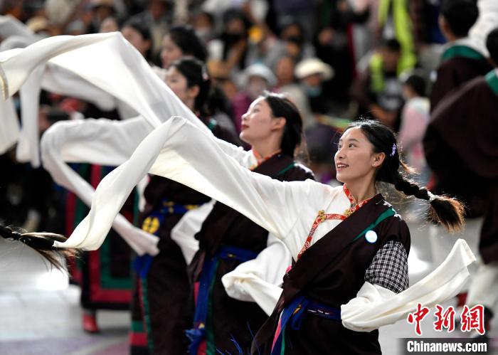 6月14日,第二屆拉薩鍋莊舞大賽決賽在布達拉宮腳下的宗角祿康公園舉辦,共有12支隊伍參賽。圖為鍋莊舞大賽決賽現場。中新社記者 李林 攝