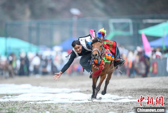 7月21日,西藏自治區(qū)拉薩市堆龍德慶區(qū)馬鎮(zhèn)朗巴村民眾賽馬歡度“望果節(jié)”。“望果節(jié)”民俗已有1500多年的歷史,是國(guó)家級(jí)非物質(zhì)文化遺產(chǎn)。圖為騎手進(jìn)行馬術(shù)表演。中新社記者 貢嘎來(lái)松 攝