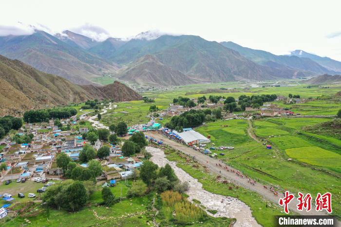 7月21日,西藏自治區(qū)拉薩市堆龍德慶區(qū)馬鎮(zhèn)朗巴村民眾賽馬歡度“望果節(jié)”。“望果節(jié)”民俗已有1500多年的歷史,是國(guó)家級(jí)非物質(zhì)文化遺產(chǎn)。圖為賽馬比賽現(xiàn)場(chǎng)。(無(wú)人機(jī)照片)中新社記者 貢嘎來(lái)松 攝