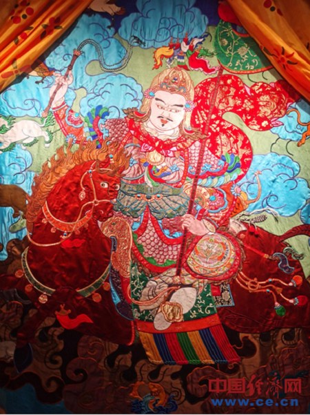 圖為羅布堆繡唐卡作品《格薩爾王》局部。 中國經(jīng)濟(jì)網(wǎng)記者 魏金金/攝