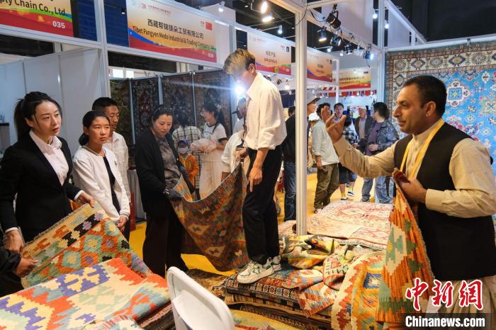 來自阿富汗喀布爾的商人阿明扎伊·穆罕默德·賈(Aminzai Mohammad Jan)主要銷售阿富汗毛毯等手工藝品,這是他第二次進藏展銷。現場,阿明扎伊·穆罕默德·賈十分忙碌,不斷為顧客挑選合適的款式和花色,顧客砍價時,他便掏出手機播放毛毯的制作過程。他說,期待這次銷量更好。