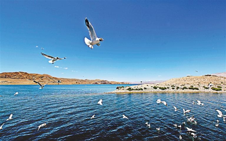 “現在的拉薩河更像一個湖,湖寬水深、濤聲陣陣,金色的陽光灑滿湖面,一陣風吹來,掀起了不少漣漪。成群結隊的候鳥在湖面自由自在地翱翔、嬉戲,讓人心曠神怡?!卑頃r分,家住頓珠金融城的拉薩市民平措在拉薩河三號閘上悠閑散步、感慨地說道。