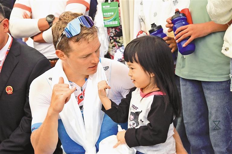 第一賽段第一名、來自飛銳蒙古洲際隊的LAAS Martin和當地孩子互動。記者 洛桑平措 謝筱純 王珊 攝