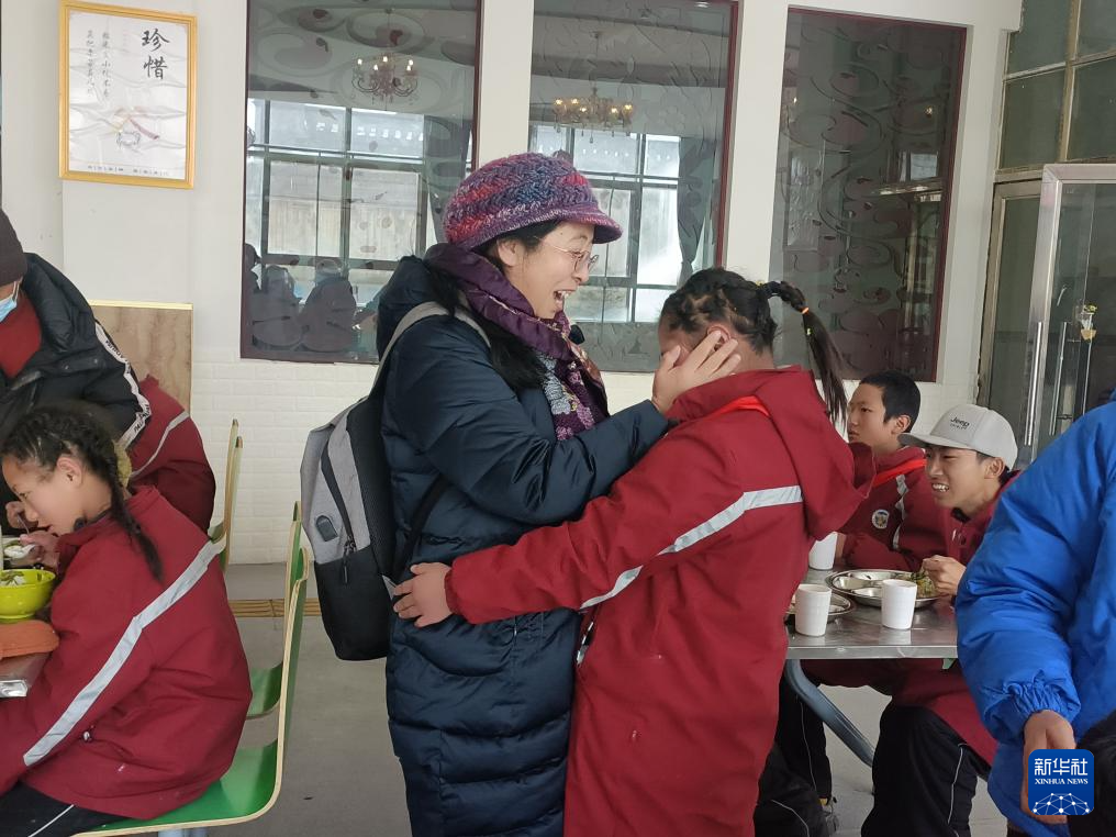 那曲市特殊教育學(xué)校的食堂里,次仁拉姆校長和提前返校的學(xué)生見面(8月23日攝)。新華社發(fā)(白瑪朗杰攝)