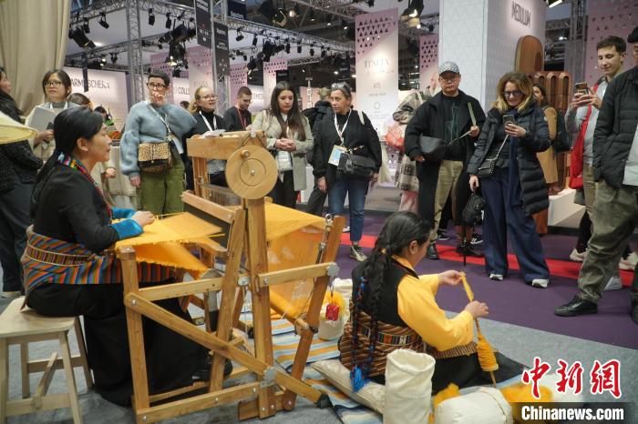 2024年1月,來(lái)自中國(guó)西藏的傳統(tǒng)氆氌亮相法國(guó)巴黎時(shí)尚家居設(shè)計(jì)展。(受訪者供圖)
