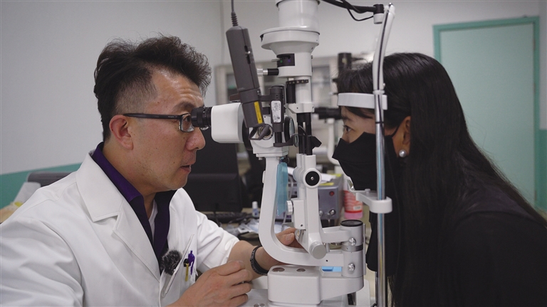 天津市第十批援藏干部、昌都市藏醫院眼科副主任醫師步紹翀開展眼科檢查。