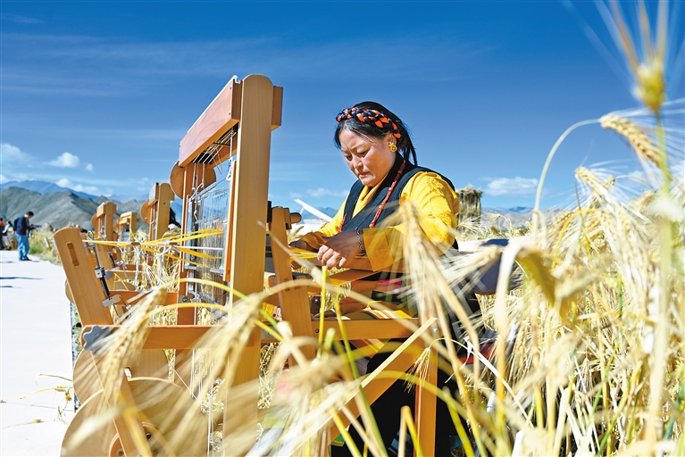 萬里晴空下,金色青稞隨風搖曳,靜等豐收的季節;希望的田地上,在傳承和創新中,千年氆氌再現輝煌。