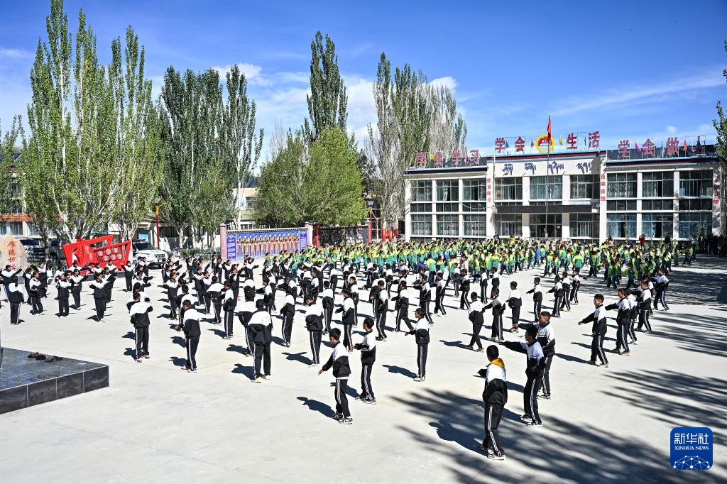 在西藏阿里地區札達縣九年一貫制學校,孩子們跳起融入國家級非物質文化遺產“宣舞”特色的課間操(9月10日攝)。新華社記者 孫瑞博 攝