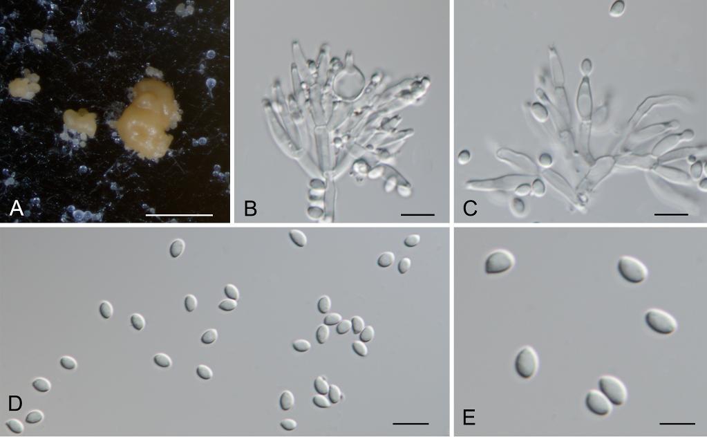 西藏螺旋聚孢霉的形態。A:PDA上形成的分生孢子團,B、C:產孢細胞及初生的分生孢子,D、E:分生孢子。標尺A=300μm;B-E=10μm。(西藏自治區生態環境廳供圖)